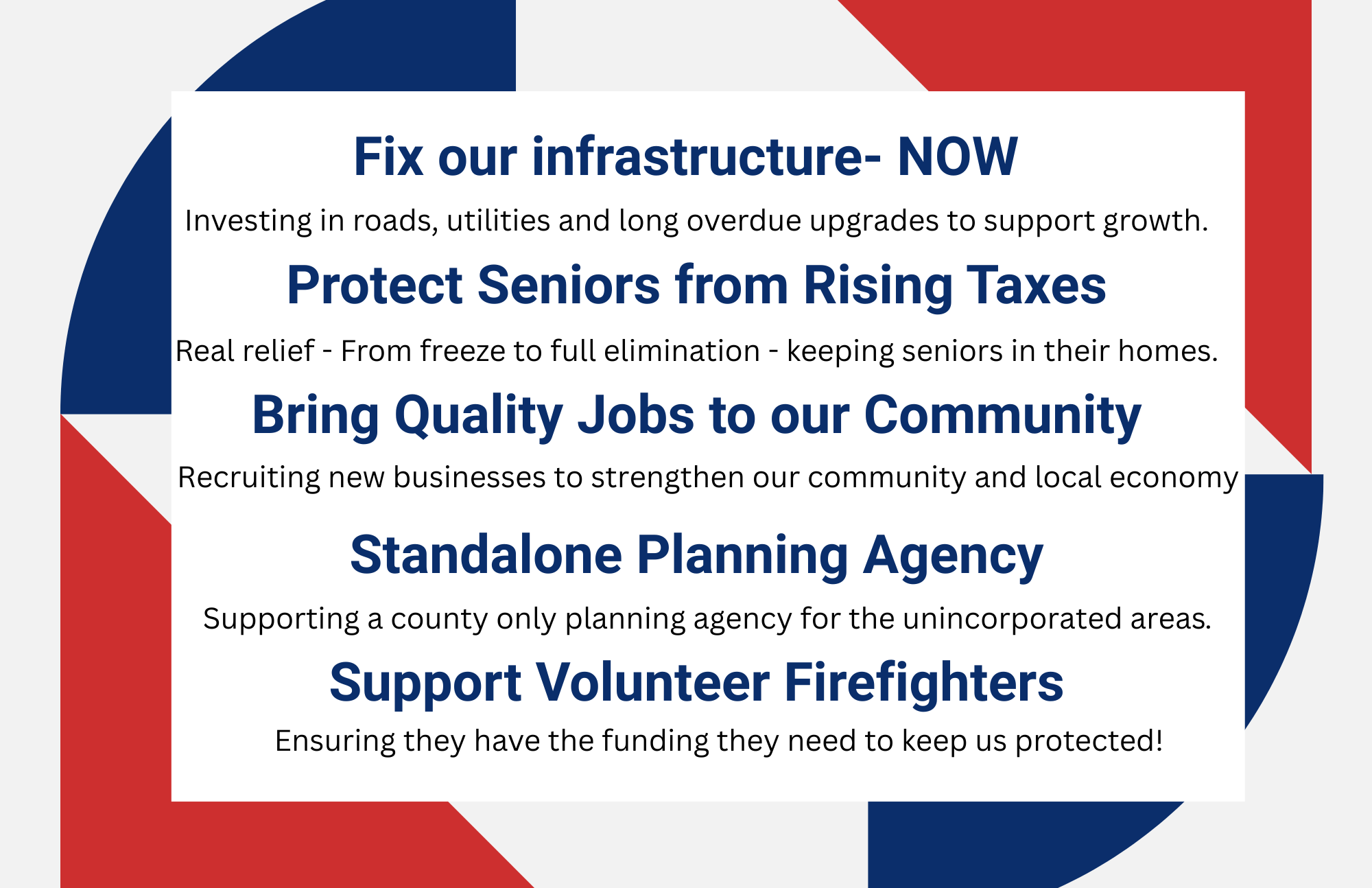 Safe infrastructure. Community Advocate. Responsible spending.